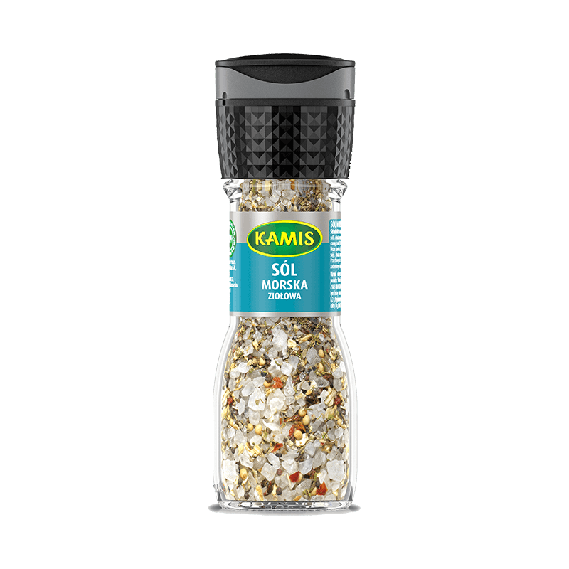 Sól Morska Ziołowa to aromatyczna mieszanka soli morskiej, ziół i przypraw, takich jak: gorczyca biała i czarna, cebula suszona, papryka czerwona, pieprz czarny, cząber, bazylia.