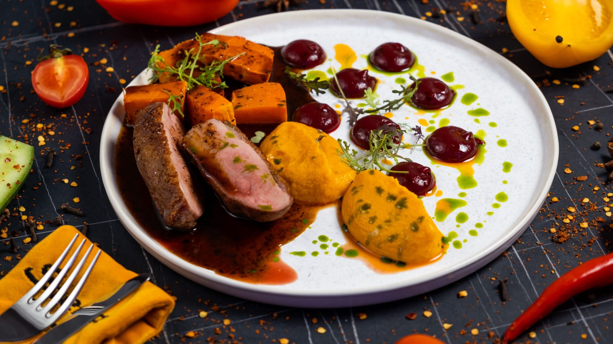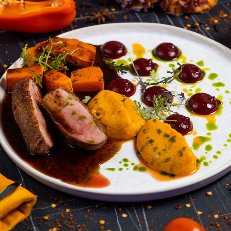 Soczysta pierś z kaczki w glazurze z musztardy żurawinowej, podana na aromatycznych jabłkach z majerankiem – proste danie o wyjątkowo wykwintnym smaku.