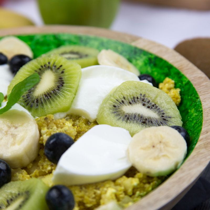- 1 szklanka pokrojonych w kostkę jabłek lub innych świeżych ulubionych owoców (np. banan, brzoskwinia, truskawki, kiwi)