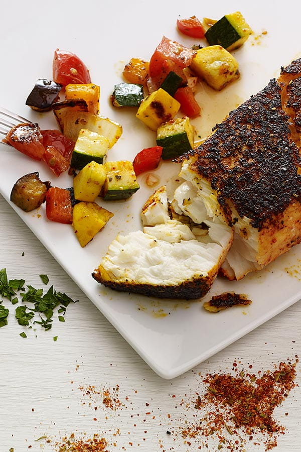 - 4 filety (bez skóry) z białej ryby: okoń morski, dorsz lub halibut (125 g każdy)