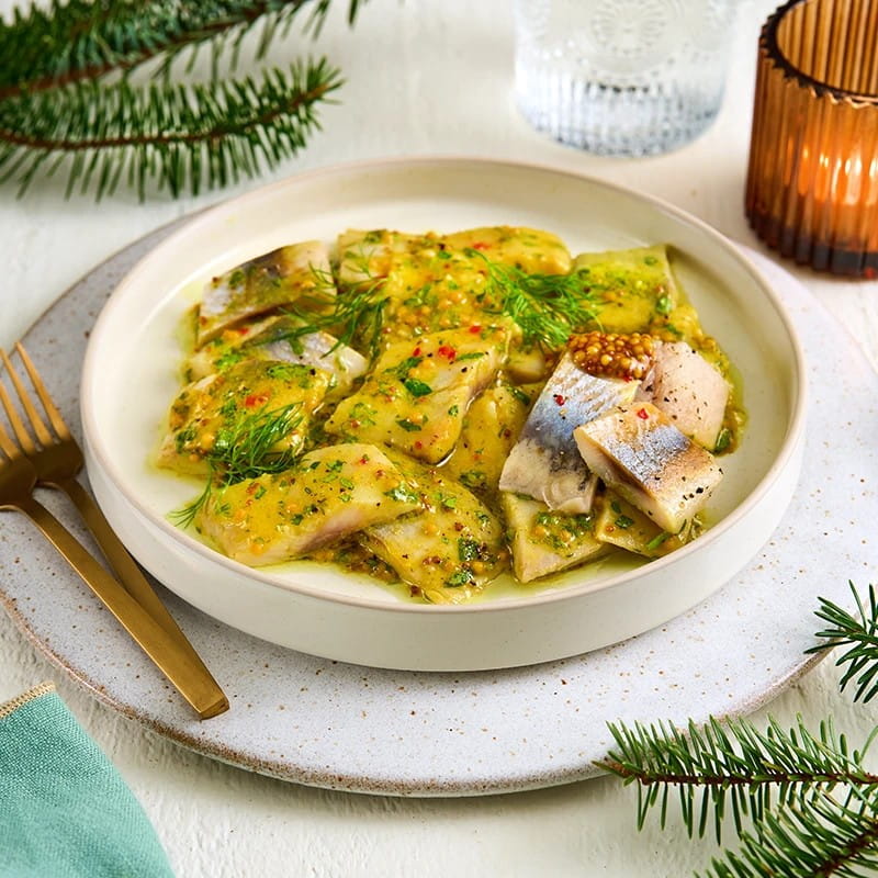 Delikatne filety śledziowe w kremowej marynacie z miodem i musztardą Kamis. Słodko-pikantne, aromatyczne i pełne smaku — idealne na świąteczny stół lub elegancką przekąskę.