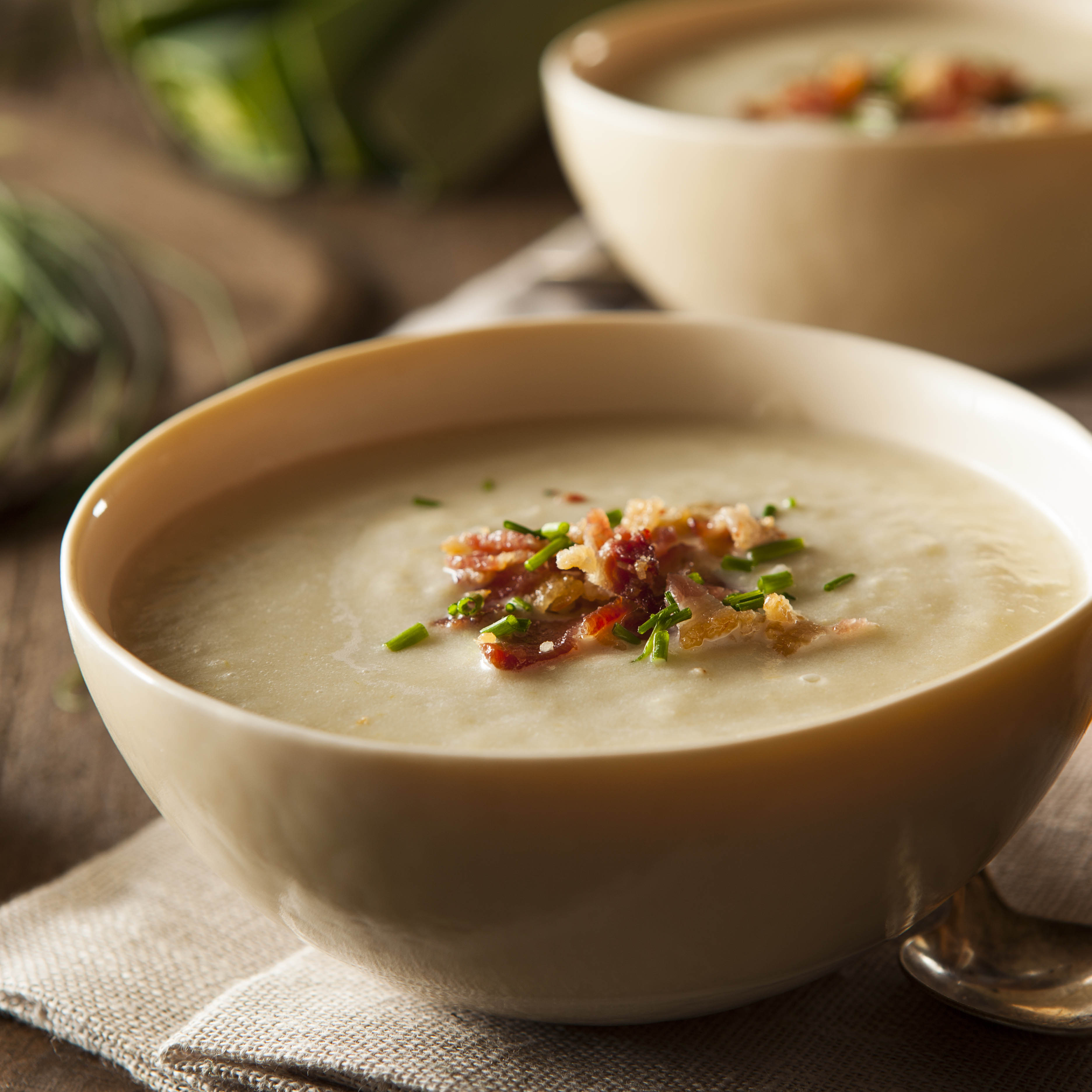 Przygotuj pyszną, sycącą i cudownie maślaną zupę porowo-ziemniaczaną z aromatyczną okrasą w postaci wędzonego boczku. Ten cudownie rozgrzewający krem idealnie sprawdzi się zarówno w roli przystawki, jak i dania głównego. Głębię smaku nada mu odrobina gałki muszkatołowej, czo...