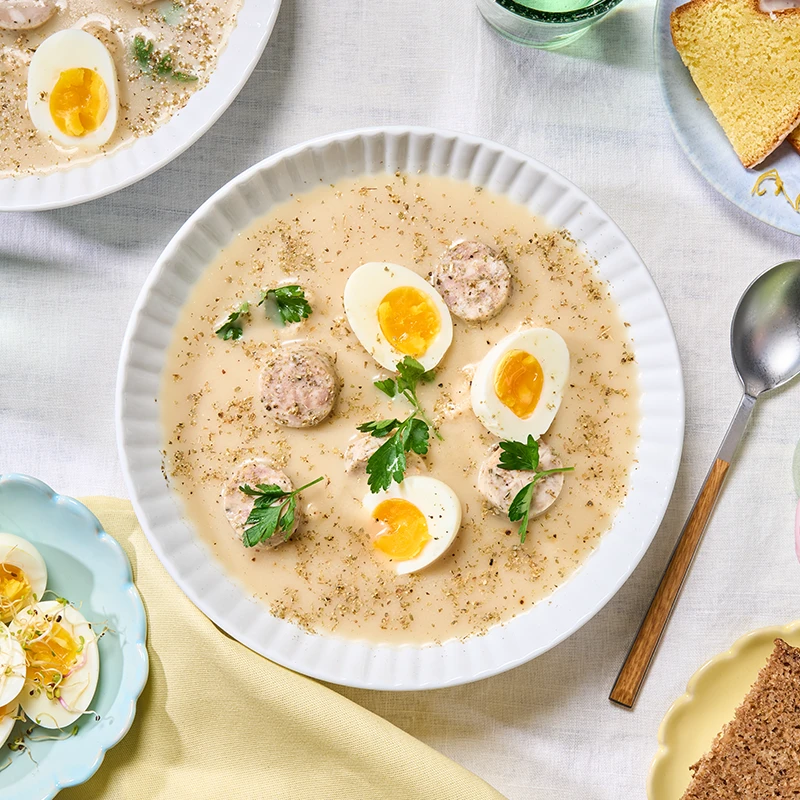 Ten wielkanocny żurek to prawdziwa klasyka świątecznego stołu. Wędzone żeberka, aromatyczne przyprawy i zakwas tworzą głęboki, intensywny smak. Chrzan, majeranek i odrobina musztardy podkreślają tradycyjny charakter zupy. Sycąca, aromatyczna i idealna na Wielkanoc.